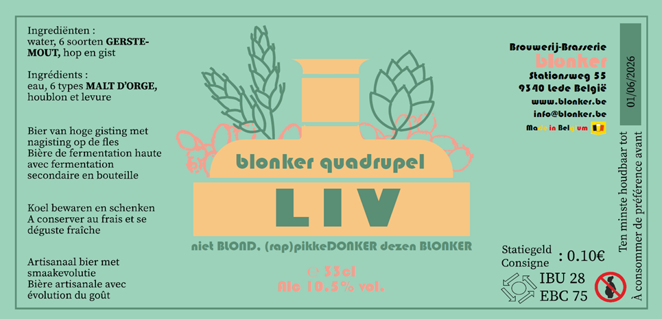 Met zijn 10,5% alcohol is BLONKER LIV een echte krachtpatser.Zacht in de mond, maar verraderlijk sterk — een bier dat je niet onderschat.